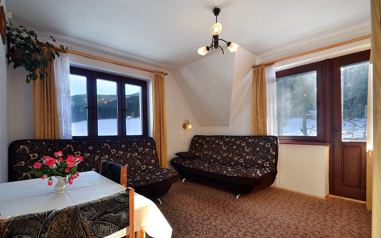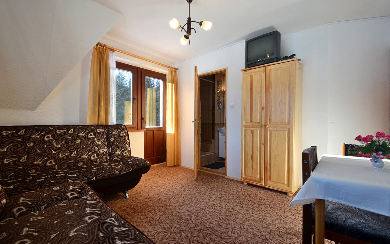 ubytovanie pre 2 + 2 osoby, s vlastnou kúpeľňou a balkónom s nádherným výhľadom na hory, ktorý Vám určite spríjemní pobyt. V izbe nájdete dve pohodlné, rozkladacie dvojlôžkové rozkladacie pohovky, súpravu